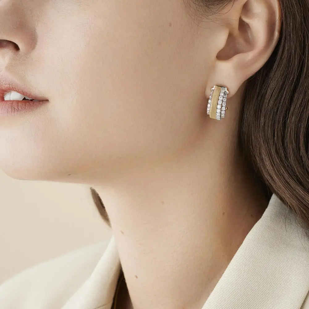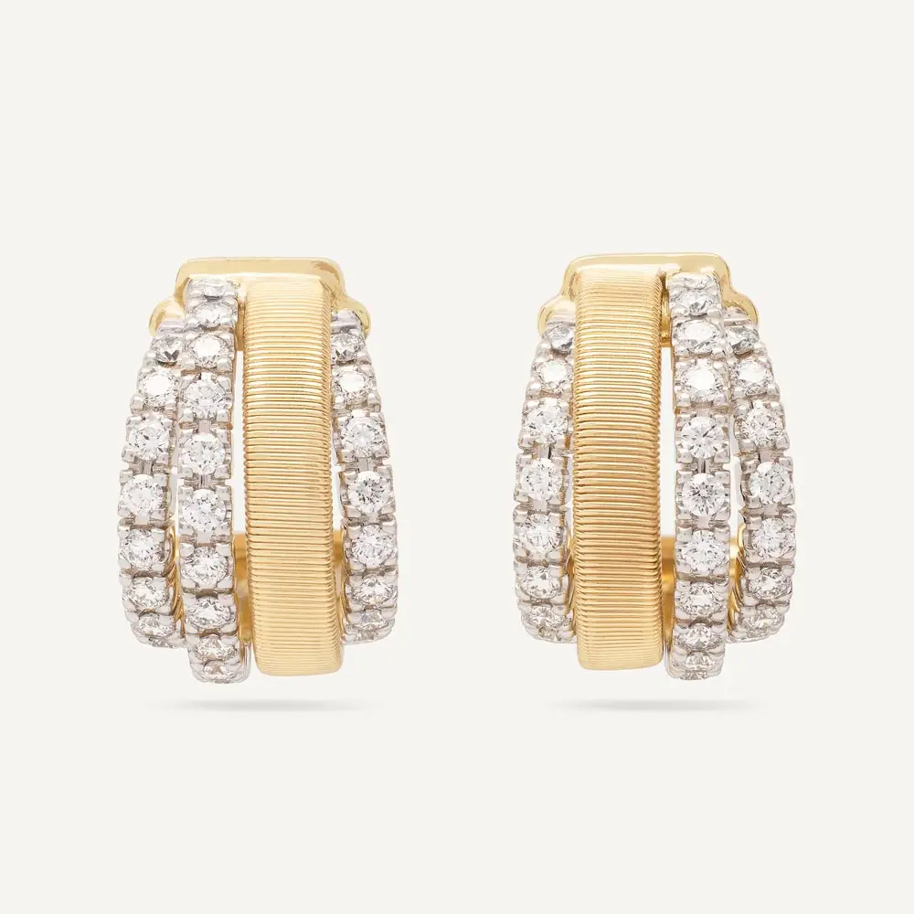 Bông tai Marco Bicego Masai OG B2 YW M5 mang đậm dấu ấn xa hoa nhờ sự kết hợp giữa kim cương nổi bật và kỹ thuật chế tác vàng tinh xảo. Chúng được làm từ vàng kết hợp 18K (750/1000) với cả hai hiệu ứng bề mặt bóng và mờ, tạo nên sự tương phản tinh tế. Khóa tai là puzeta (đinh khuyên) — cố định và thoải mái khi đeo.