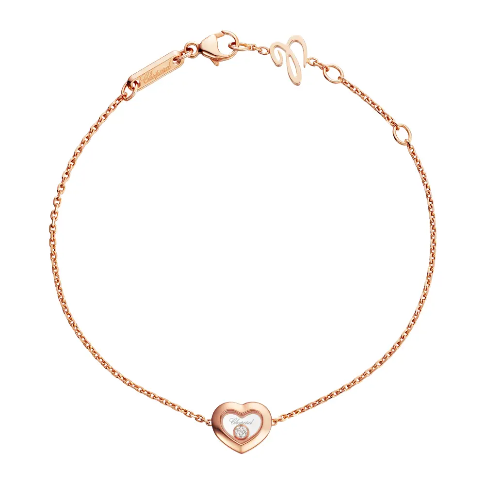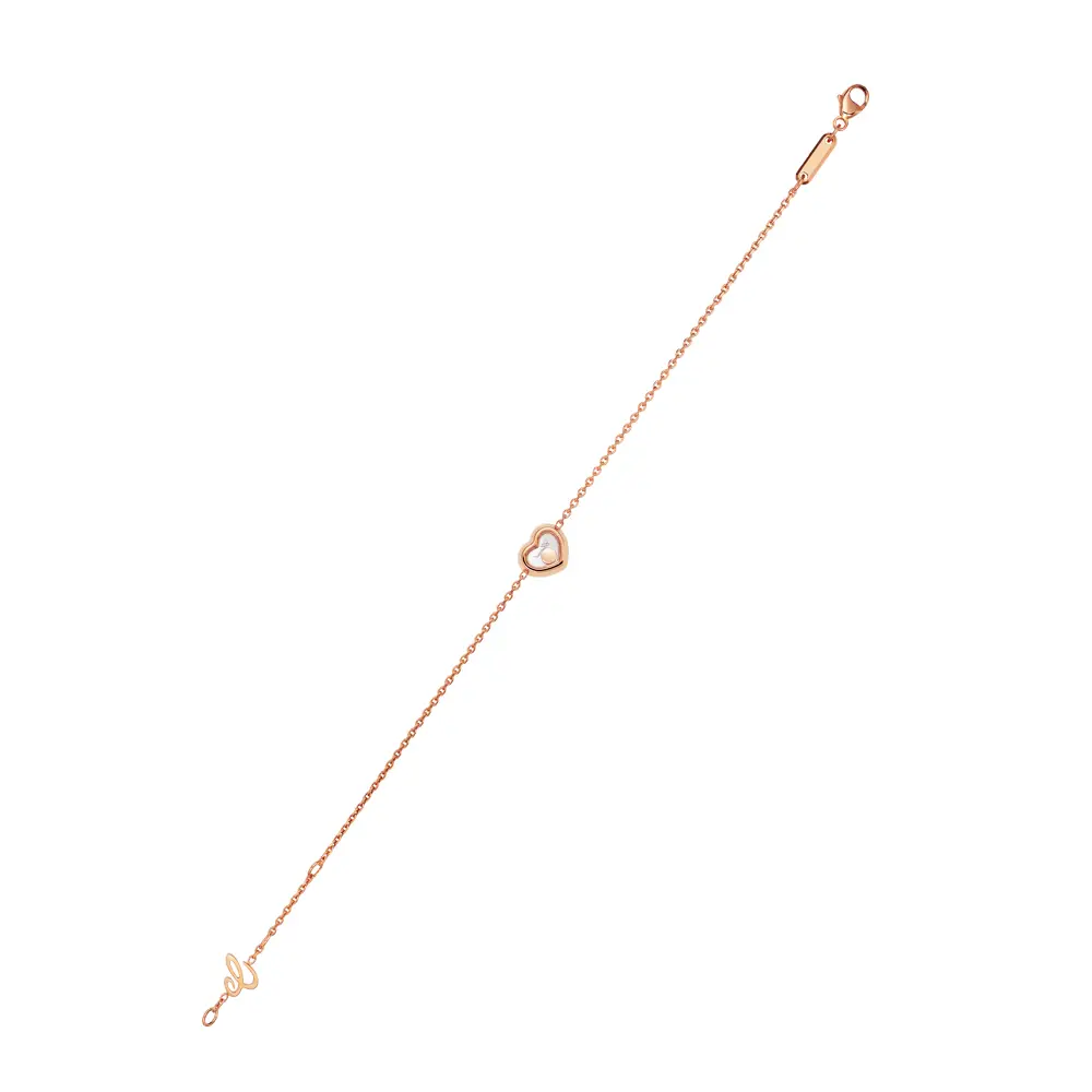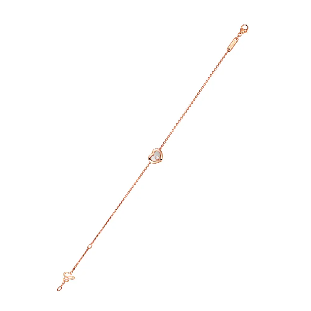 Chiếc vòng tay được chế tác từ vàng hồng 18K, đính một viên kim cương tự do (0,05 ct) lơ lửng giữa hai lớp kính sapphire trong hình trái tim tinh xảo. Sự kết hợp giữa sắc vàng ấm áp và ánh sáng rực rỡ của kim cương tạo nên vẻ đẹp cân bằng giữa sự lãng mạn và phong cách tối giản hiện đại.