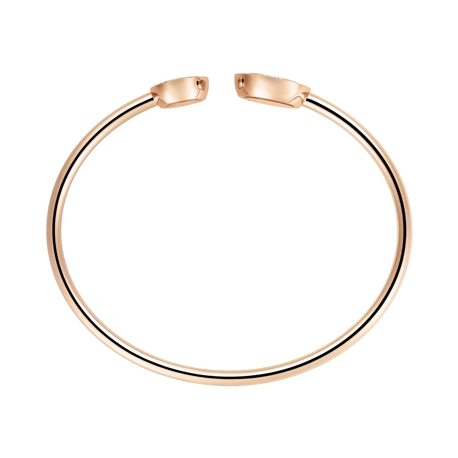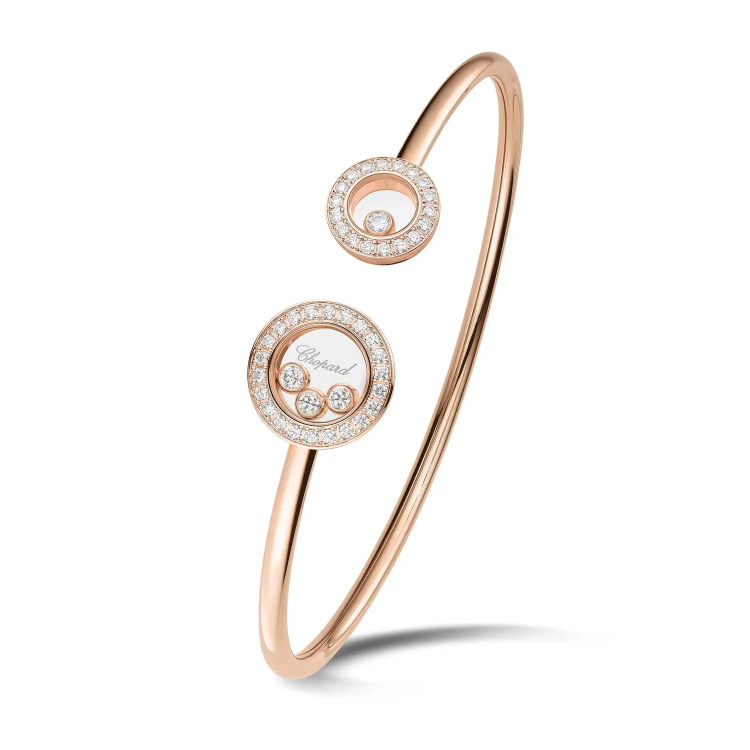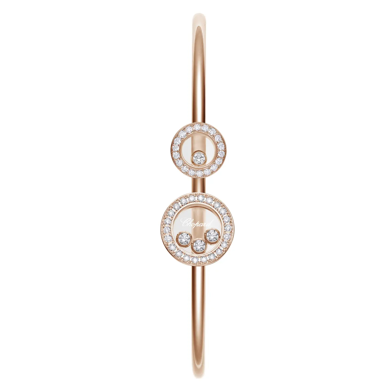 Chiếc vòng tay sang trọng này thuộc bộ sưu tập Happy Diamonds, thể hiện sự tinh tế, vui tươi và tay nghề chế tác bậc thầy. Được chế tác từ vàng hồng 18 k, đính 44 viên kim cương tổng trọng lượng khoảng 0,54 ct, mỗi viên phản chiếu ánh sáng tuyệt đẹp, tạo nên vẻ lấp lánh đầy quyến rũ.