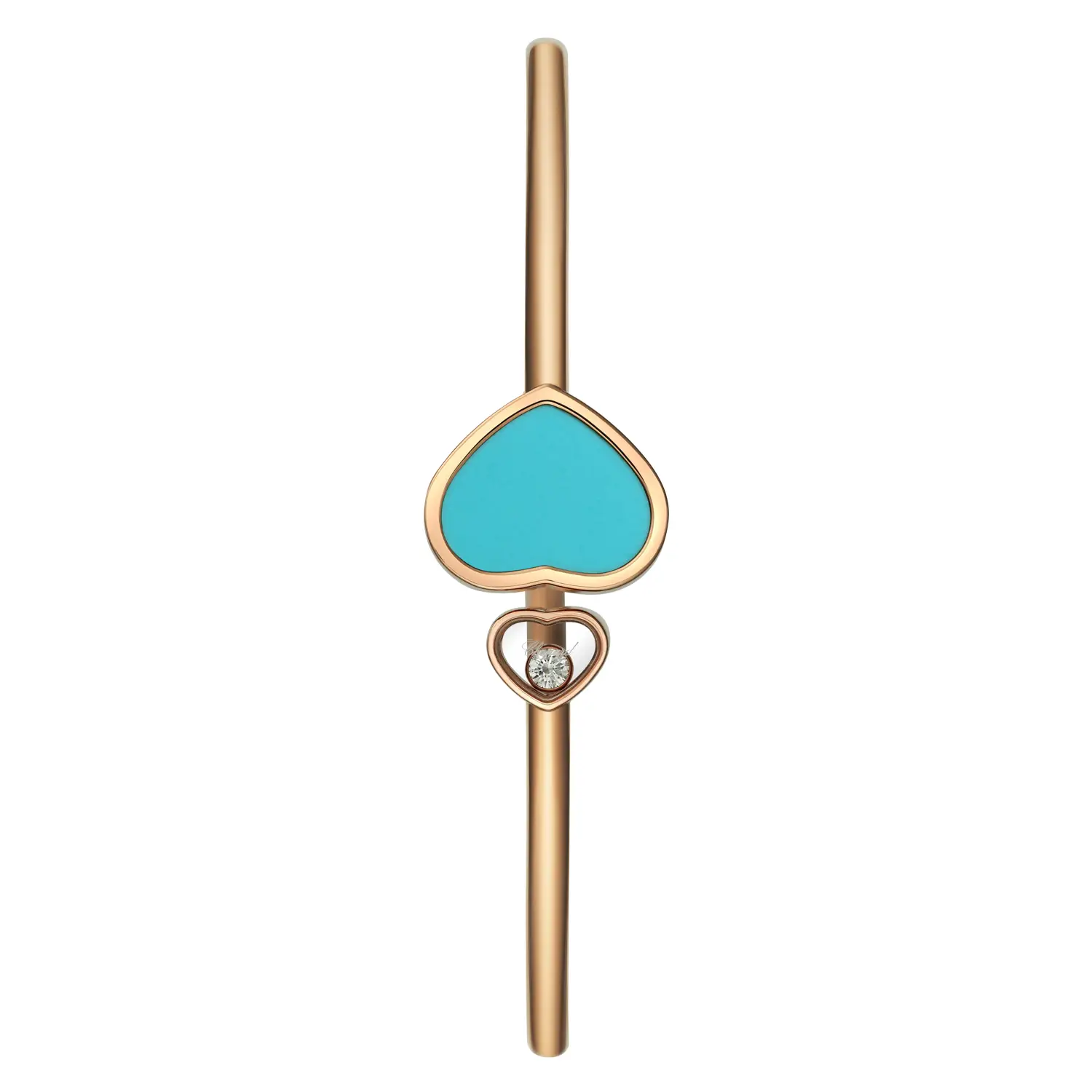 Chiếc vòng tay tinh tế này thuộc bộ sưu tập Happy Hearts, thể hiện niềm vui, vẻ đẹp nữ tính và tinh thần lạc quan của Chopard. Được chế tác từ vàng hồng 18 k, đính mặt trái tim bằng đá ngọc lam cùng viên kim cương chuyển động tự do khoảng 0,05 ct, mang lại sự kết hợp hoàn hảo giữa thiết kế trẻ trung và nét thanh lịch vượt thời gian.