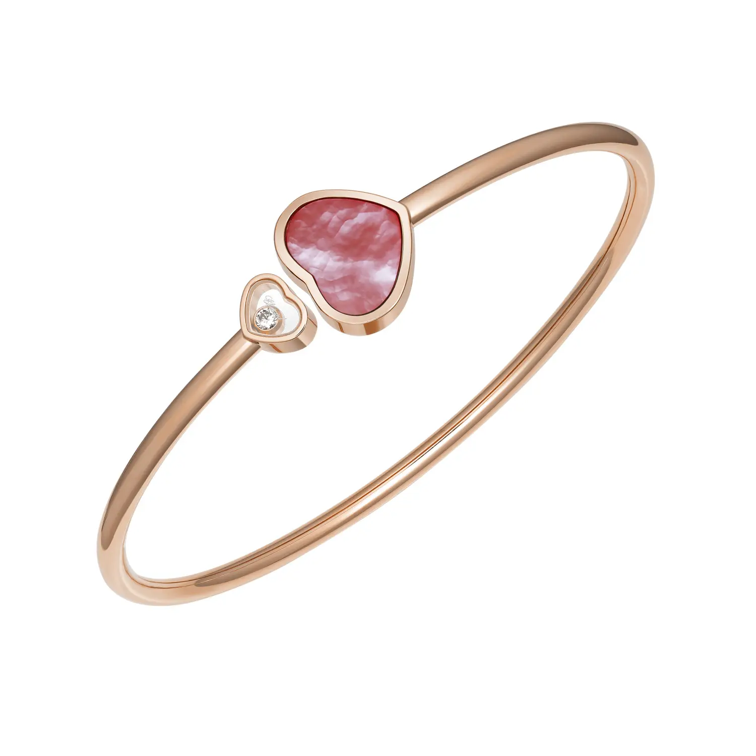 Chiếc vòng tay duyên dáng này thuộc bộ sưu tập Happy Hearts, mang đến niềm vui, tình yêu và nét đẹp nữ tính. Được chế tác từ vàng hồng 18 k, điểm xuyết trái tim đá đỏ cùng viên kim cương chuyển động tự do khoảng 0,05 ct, tỏa sáng rực rỡ trong từng cử động. Màu đỏ tượng trưng cho năng lượng, đam mê và hạnh phúc, khiến thiết kế trở nên nổi bật và cuốn hút.
