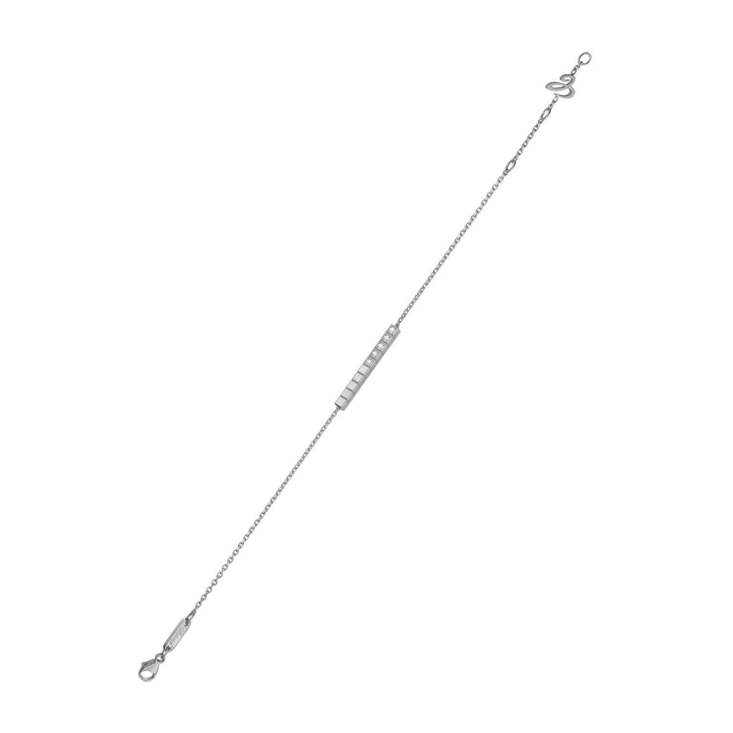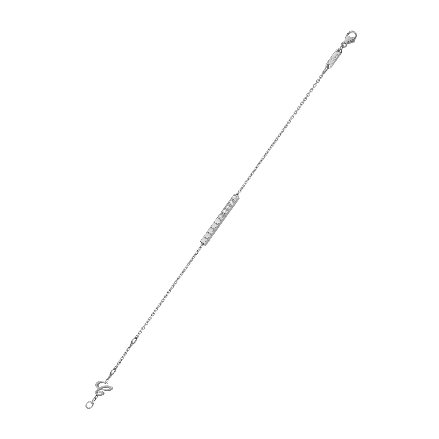 Chiếc vòng tay thanh lịch này thuộc bộ sưu tập Ice Cube Pure, thể hiện sự tinh giản và sang trọng thuần khiết. Được chế tác từ vàng trắng 18 k có nguồn gốc đạo đức, đính 10 viên kim cương tổng trọng lượng khoảng 0,10 ct, lấy cảm hứng từ hình khối lập phương của những viên đá lạnh, phản chiếu ánh sáng tinh tế trong từng chuyển động.