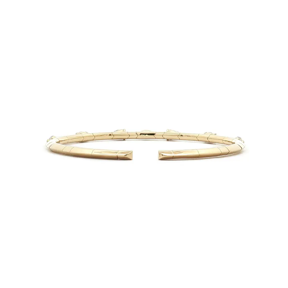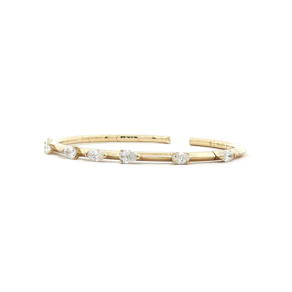 Chiếc vòng tay cứng bằng vàng vàng 18K phong cách cuff kết hợp nét thanh lịch vượt thời gian với thiết kế hiện đại. Đường vàng tinh giản được đính 7 viên kim cương với giác cắt tinh tế – oval, marquise và giọt nước – tạo nên ánh sáng rực rỡ.