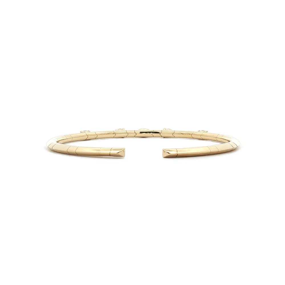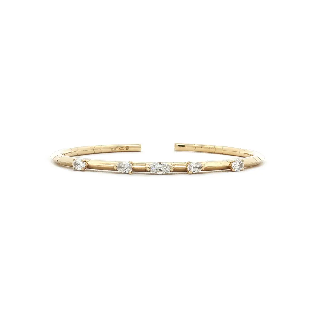 Chiếc vòng tay cứng cáp bằng vàng 18K màu vàng này mang phong cách cổ tay áo, thể hiện sự sang trọng hiện đại và tinh tế. Đường nét tối giản của vàng được nhấn mạnh bởi năm viên kim cương có hình dáng độc đáo – hình bầu dục, hình marquise và hình giọt nước – kết hợp với nhau tạo ra hiệu ứng ánh sáng độc đáo.