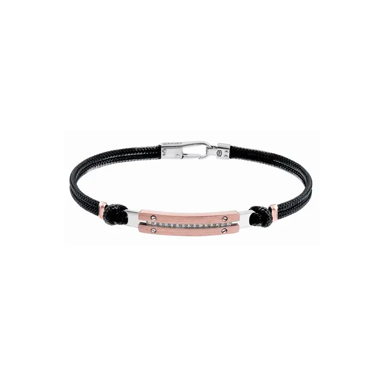 Vòng tay nam bằng vàng đính kim cương mang tinh thần hiện đại, kết hợp thiết kế tinh gọn với chế tác Ý chuẩn xác. Chế tác từ vàng 18kt (750/1000) hai tông trắng & vàng (bicolor) cùng tương phản bóng / mờ tinh tế. Kết cấu linh hoạt kiểu dây (cord-style) ôm tay thoải mái, dễ phối từ áo thun đến áo vest.