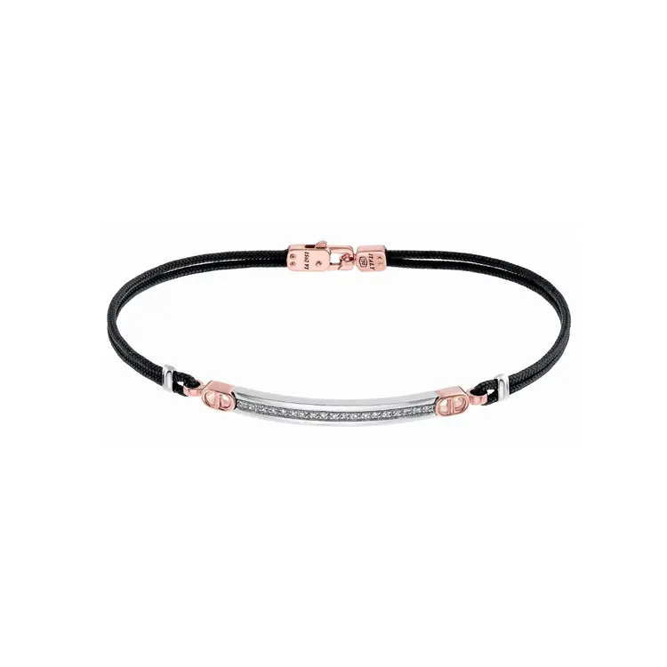 Vòng tay nam Zancan đính kim cương kết hợp thẩm mỹ bicolor hiện đại với chế tác Ý chuẩn xác. Chế tác từ vàng 18kt (750/1000) hai tông trắng & hồng cùng hoàn thiện đánh bóng, mang diện mạo tinh tế, nam tính. Kết cấu linh hoạt kiểu dây (cord-style) ôm tay thoải mái, giữ vẻ thanh lịch trong cả trang phục thường ngày lẫn trang trọng.