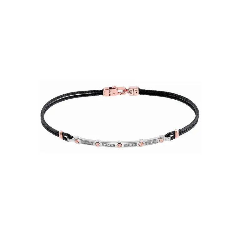 Vòng tay nam Zancan đính kim cương kết hợp thẩm mỹ bicolor hiện đại với chế tác Ý chuẩn xác. Chế tác từ vàng 18kt (750/1000) hai tông trắng & hồng cùng hoàn thiện đánh bóng. Kết cấu linh hoạt kiểu dây (cord-style) ôm tay thoải mái, giữ vẻ thanh lịch từ trang phục thường ngày đến trang trọng — phụ kiện đa dụng mỗi ngày.