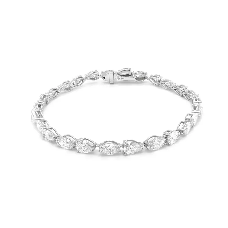Vòng đính hai loại kim cương trắng tự nhiên – 13 viên dạng giọt nước (Pear) tổng trọng lượng 4,42 ct và 13 viên dạng marquise nặng 4,27 ct. Tất cả đều có màu G và độ tinh khiết VS, mang lại ánh sáng rực rỡ và vẻ đẹp hoàn hảo.