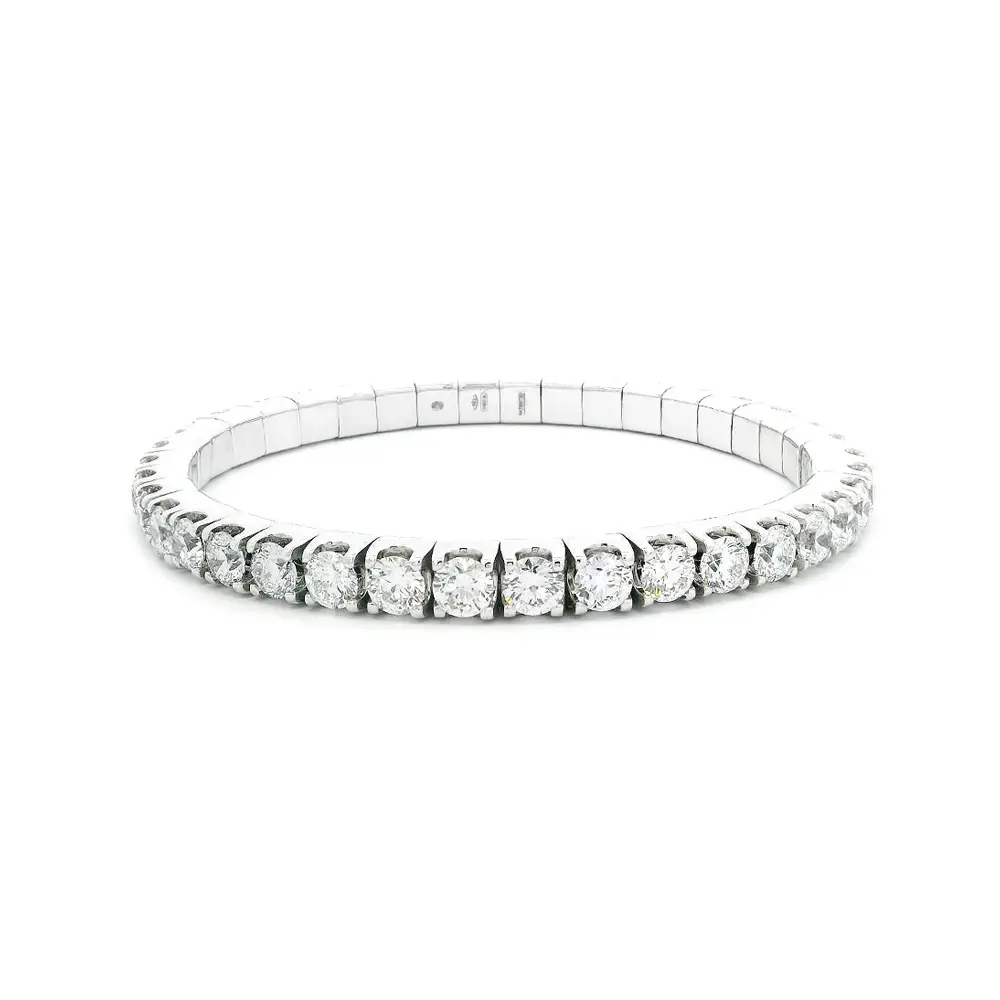 Vòng tay được đính 39 viên kim cương tự nhiên tròn, tổng trọng lượng 11,87 ct. Mỗi viên có đường kính 4,25 mm, sở hữu màu G và độ tinh khiết VS – tỏa sáng với độ rực rỡ tự nhiên và sang trọng. Vàng trắng làm nổi bật sắc sáng của kim cương, tạo nên hiệu ứng ánh sáng huyền ảo khi chuyển động.