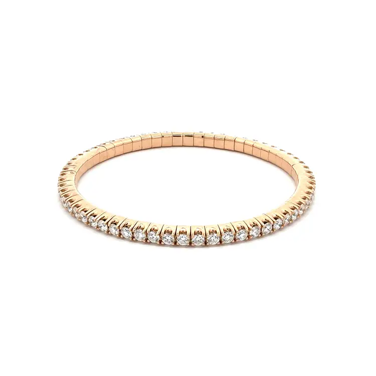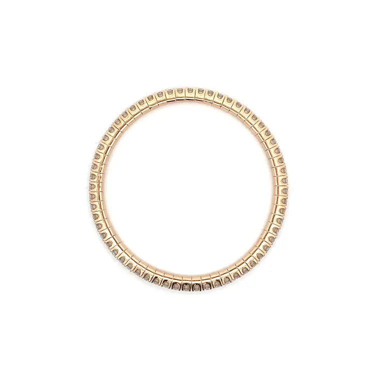 Vòng tennis Beny Jewellery bằng vàng hồng là sự kết hợp hoàn hảo giữa tinh tế và đẳng cấp. Được chế tác từ vàng 18 kt (750/1000) với bề mặt đánh bóng sáng gương, chiếc vòng được nạm 59 viên kim cương tự nhiên tổng cộng 4,81 ct, tạo nên chuỗi ánh sáng liền mạch quanh cổ tay. Mỗi viên kim cương đều được cắt tròn tinh xảo, phản chiếu ánh sáng một cách hoàn hảo.