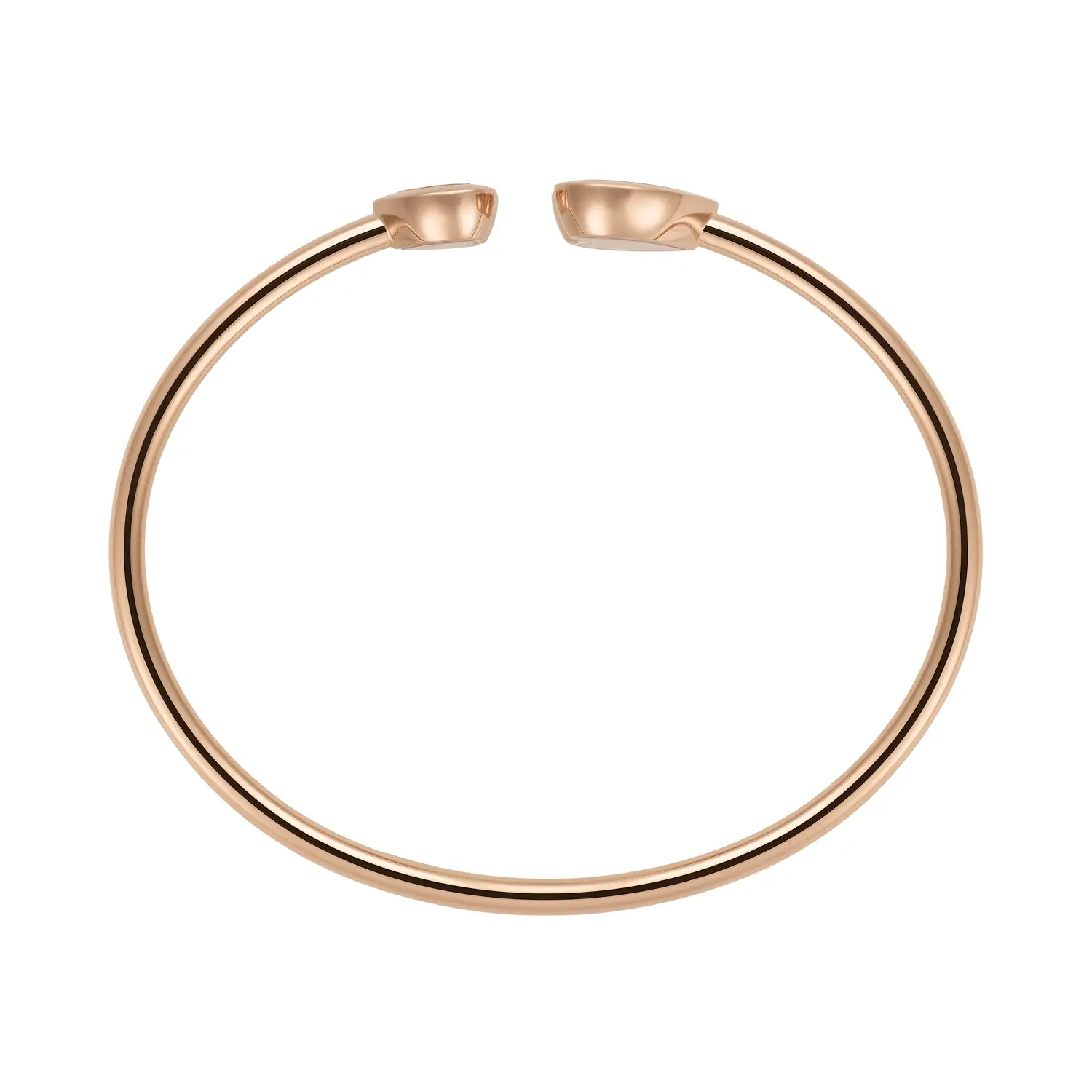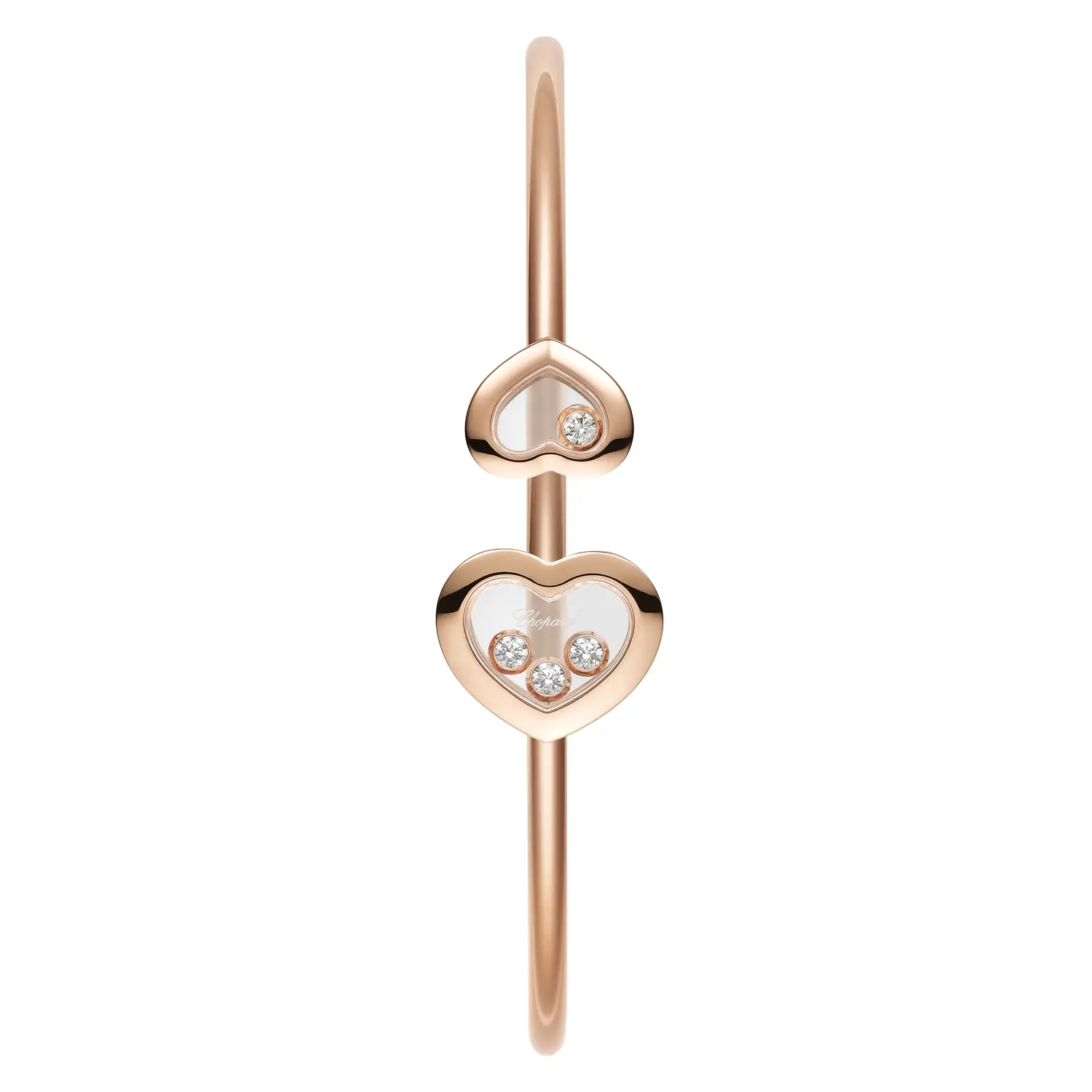 Chiếc vòng tay tinh tế này thuộc bộ sưu tập Happy Diamonds Icons, thể hiện vẻ đẹp nhẹ nhàng, nữ tính và rực rỡ ánh sáng – phong cách đặc trưng của Chopard. Được chế tác từ vàng hồng 18 k, đính 4 viên kim cương chuyển động tự do tổng trọng lượng khoảng 0,20 ct, mỗi viên được đặt giữa hai lớp kính sapphire, tạo nên hiệu ứng lung linh khi di chuyển.