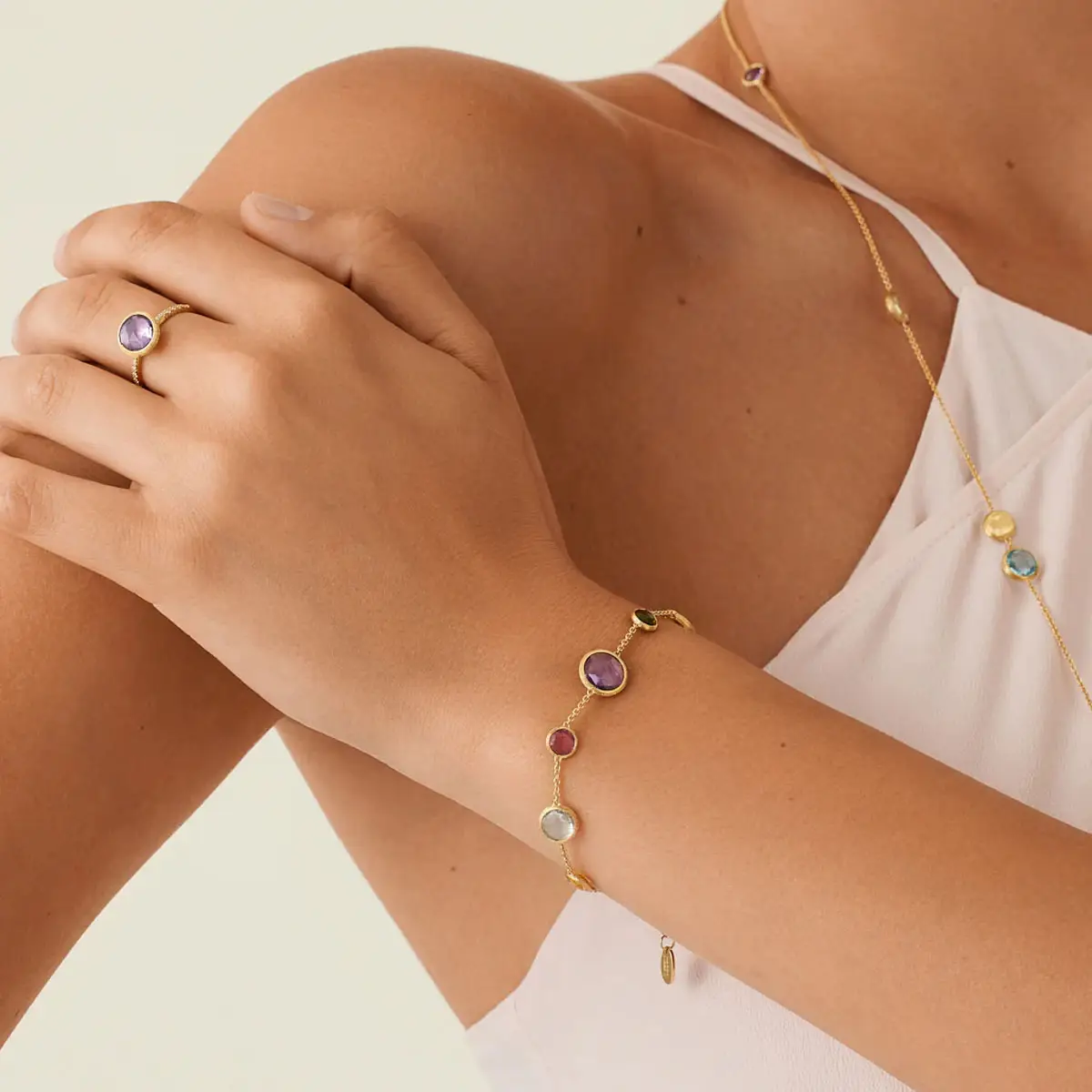 Bộ sưu tập Jaipur là lời tôn vinh màu sắc rực rỡ và ánh sáng lấp lánh của đá quý. Cảm hứng đến từ thành phố Jaipur của Ấn Độ – được mệnh danh là “thành phố đá quý” – với truyền thống lâu đời trong nghệ thuật cắt mài. Đặc trưng của bộ sưu tập là những viên đá tròn nhiều màu sắc, bắt sáng và phản chiếu vẻ đẹp tự nhiên.