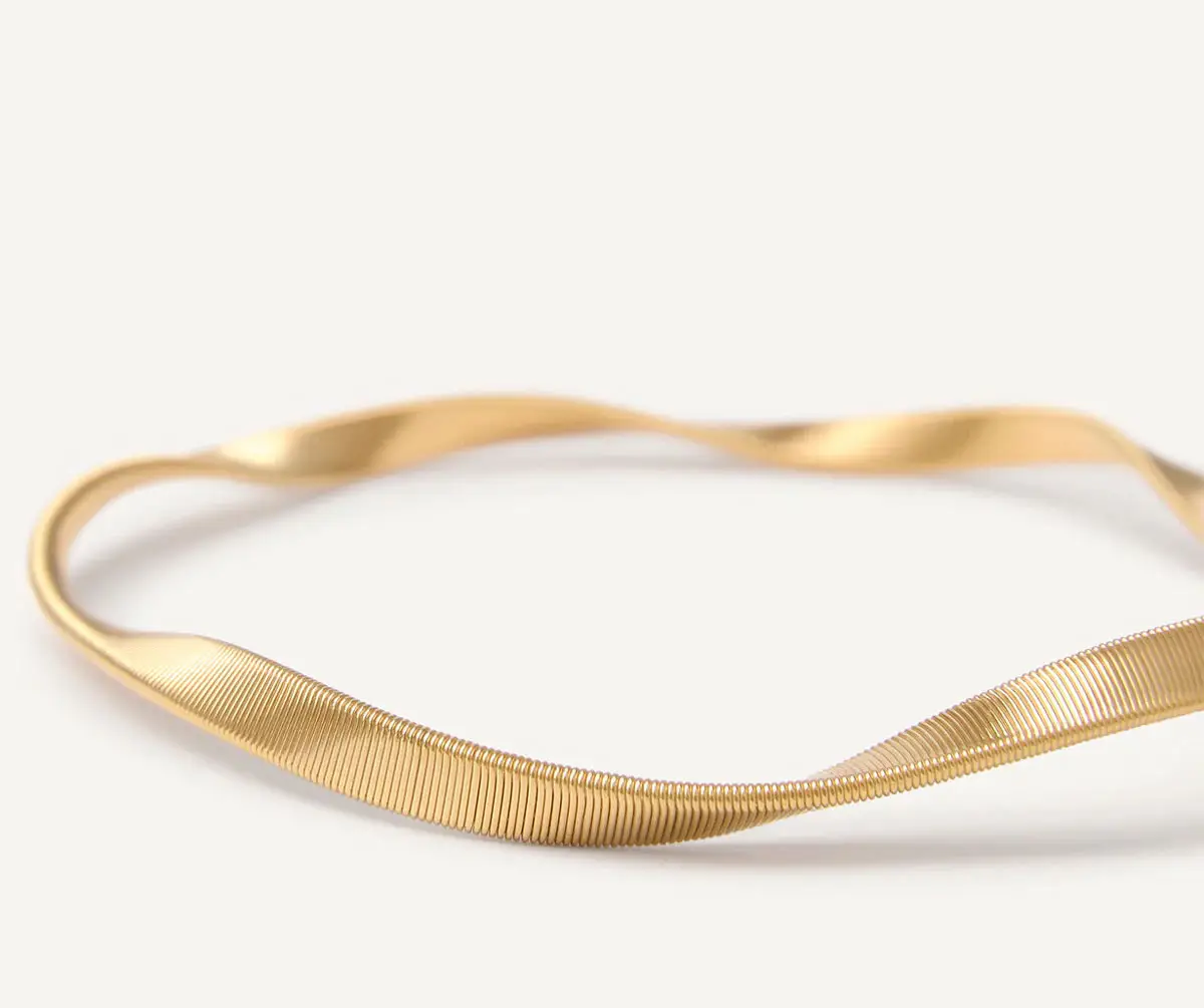 Mỗi món trang sức được chế tác từ vàng 18K và trang trí bằng kỹ thuật xoắn dây thủ công đặc trưng của Marco Bicego. Chi tiết này mang lại sự chuyển động tinh tế, kết cấu và chiều sâu, khiến trang sức trở nên sống động và độc đáo. Marrakech bao gồm dây chuyền, vòng tay, hoa tai và nhẫn, nhiều mẫu còn được tô điểm bằng kim cương để tăng thêm sự rực rỡ.