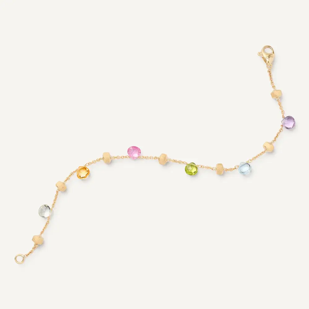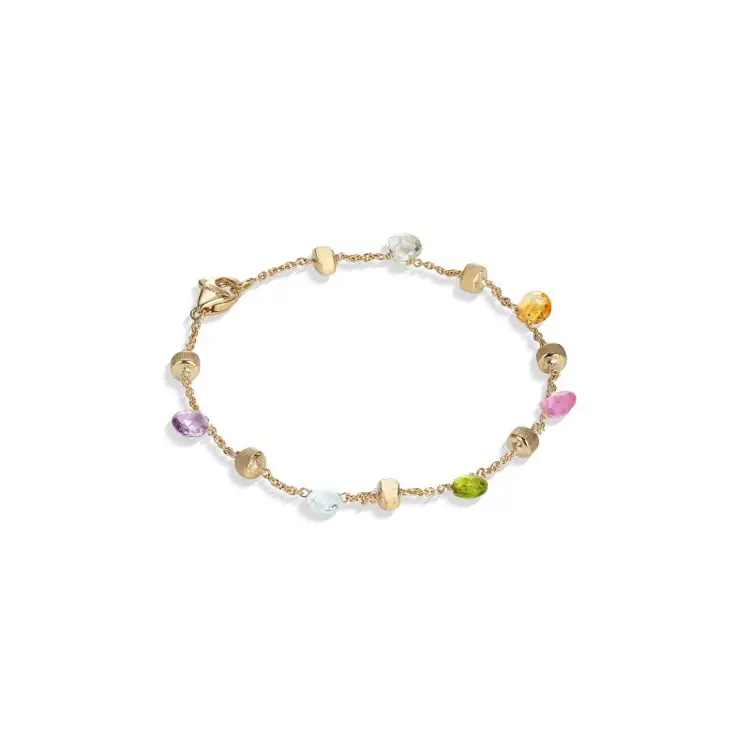 Bộ sưu tập Paradise là lời ca ngợi màu sắc, ánh sáng và niềm vui cuộc sống. Marco Bicego kết hợp những sợi dây chuyền vàng 18K tinh xảo với bảng màu đá quý rực rỡ – từ tourmaline, aquamarine cho tới thạch anh và topaz. Kết quả là những món trang sức tràn đầy năng lượng tươi vui, gợi nhớ đến bãi biển ngập nắng và không khí tự do của mùa hè.
