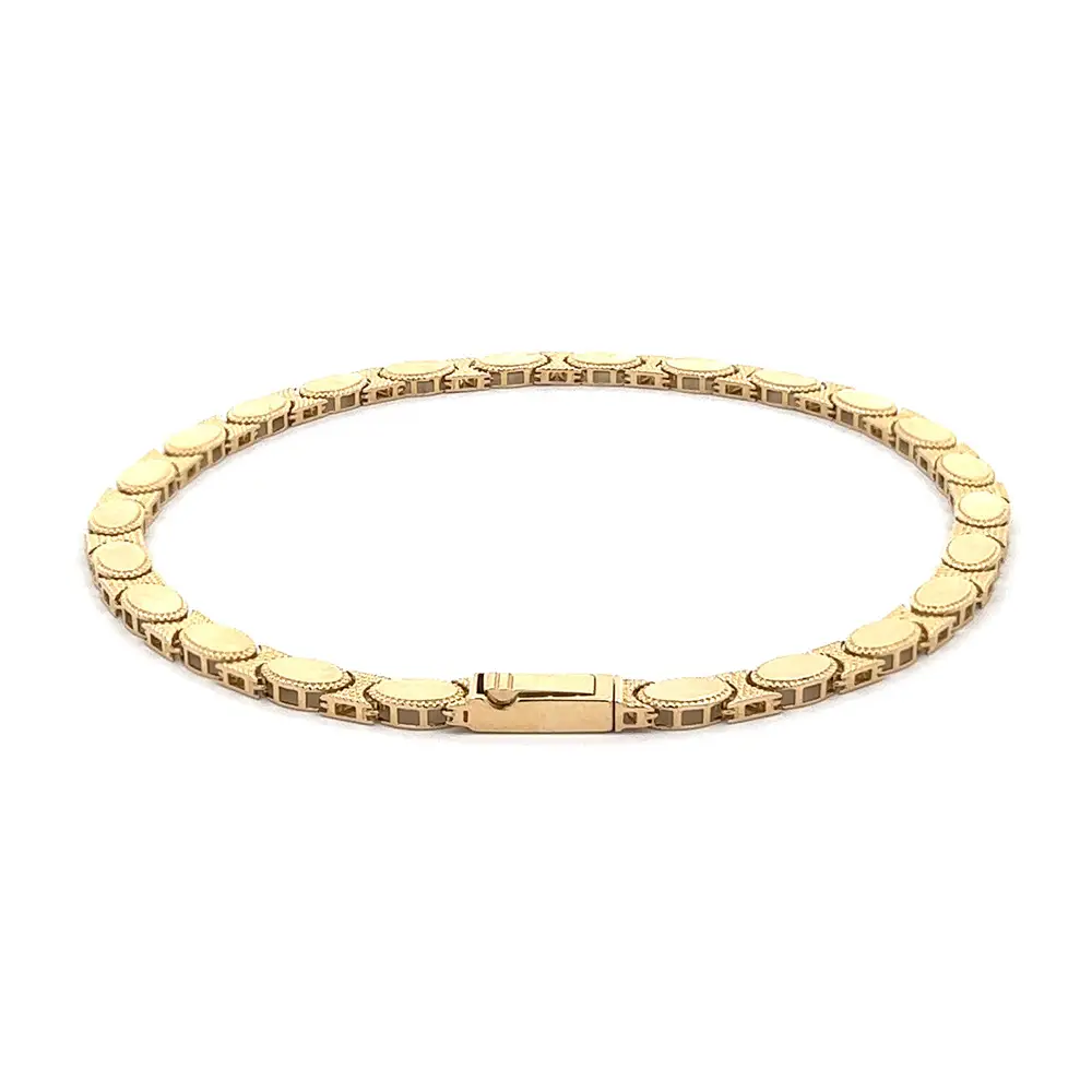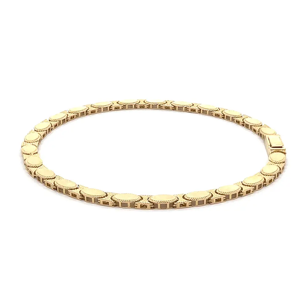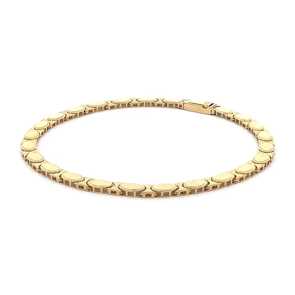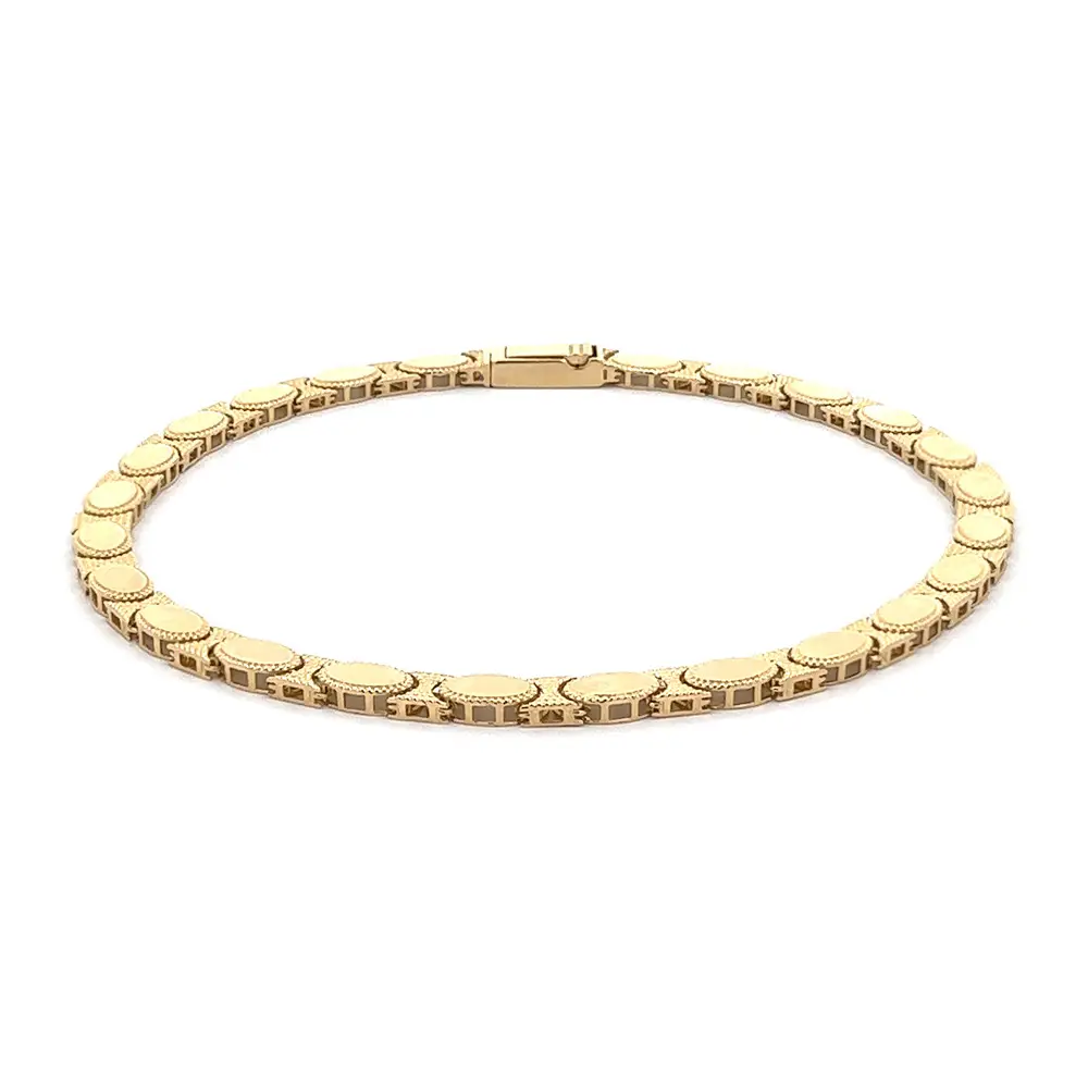 Chiếc vòng tay vàng mắt xích hình bầu dục là biểu tượng của sự thanh lịch cổ điển và tay nghề chế tác tinh xảo. Mỗi mắt xích được tạo hình mềm mại, viền họa tiết tinh tế mang lại chiều sâu và ánh sáng lấp lánh.