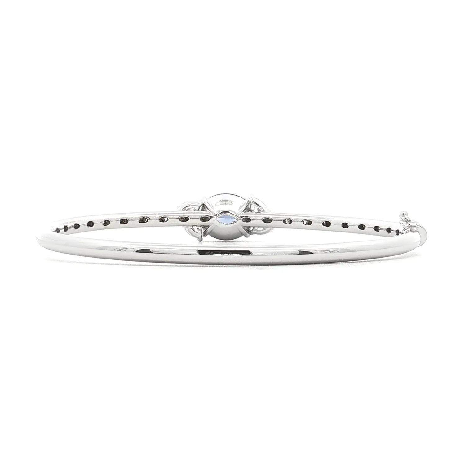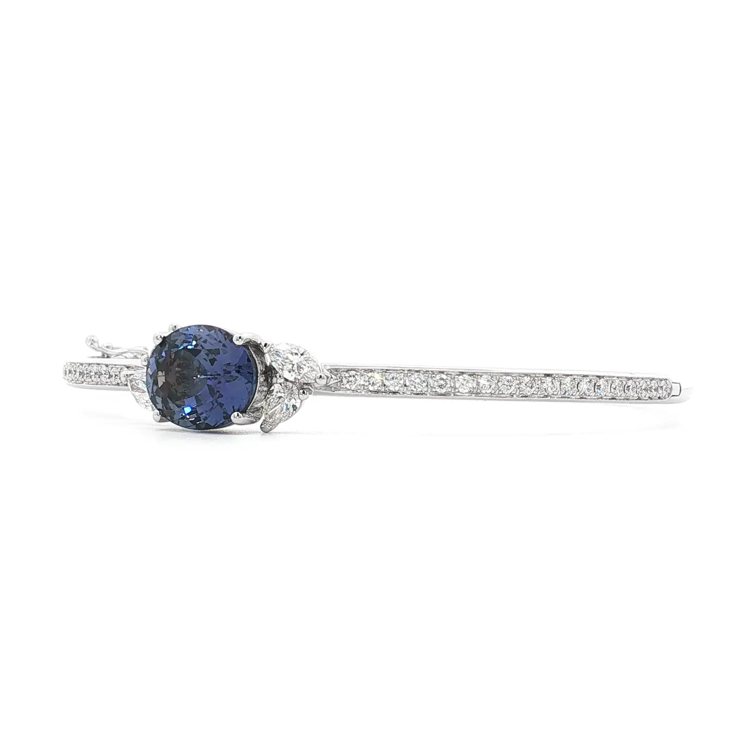Chiếc vòng tay vàng trắng này là biểu tượng của vẻ đẹp tinh tế và sang trọng vượt thời gian. Trung tâm của thiết kế là viên đá tanzanite cắt bầu dục với sắc tím-xanh quyến rũ thay đổi theo ánh sáng. Hai bên được tô điểm bằng những viên kim cương cắt tròn, tôn lên vẻ lấp lánh và chiều sâu của viên đá chủ.