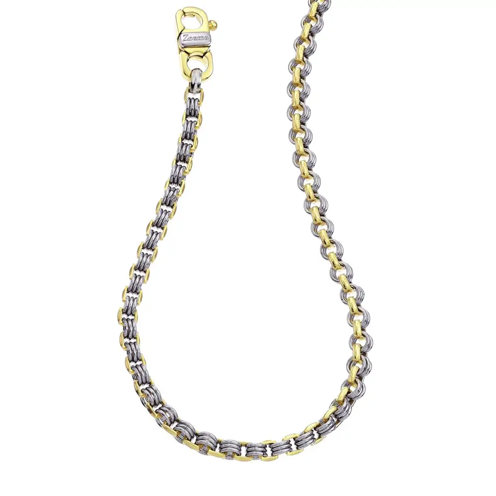 Mẫu dây chuyền của Zancan nổi bật với thiết kế vượt thời gian và kỹ thuật chế tác tinh xảo mang phong cách Ý. Sự kết hợp giữa vàng trắng và vàng vàng tạo nên hiệu ứng tương phản hài hòa, mang lại diện mạo hiện đại nhưng vẫn thanh lịch. Đường nét tối giản cùng tỷ lệ cân đối giúp sản phẩm dễ dàng phù hợp cho việc sử dụng hằng ngày.